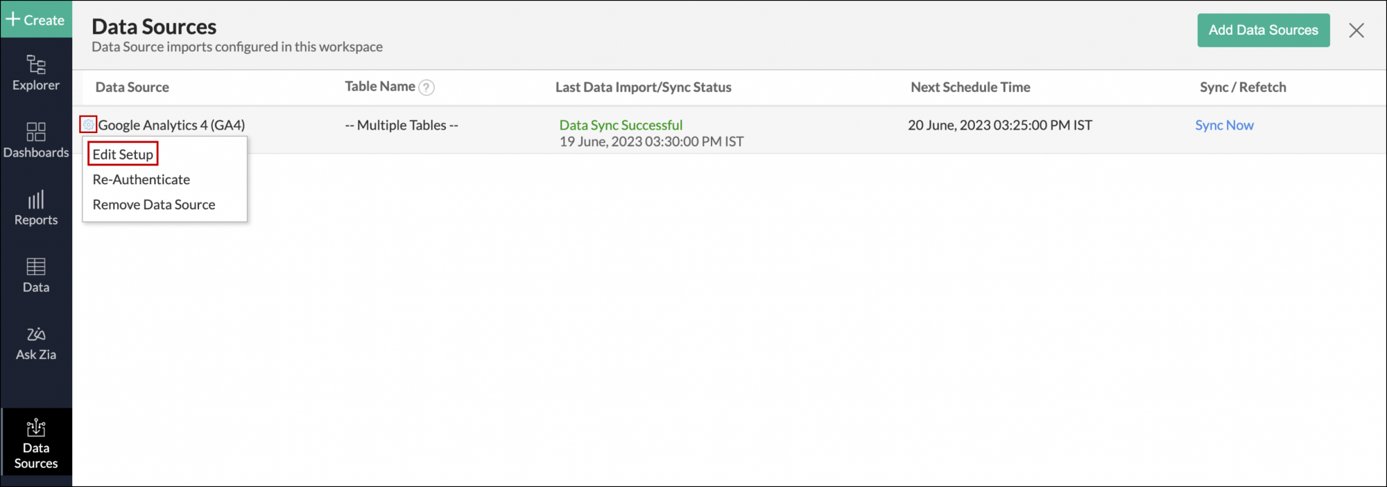 Click the Settings icon that appears on the mouse over on the Google Analytics 4 (GA4) data source and click the Edit Setup option.