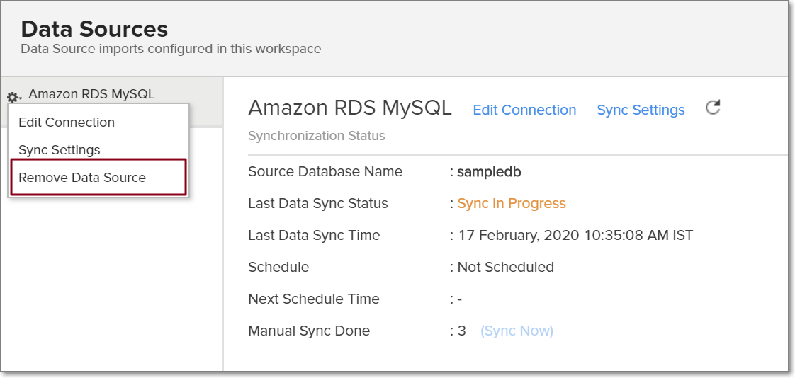 Note: Removing the data source does not delete the corresponding tables and reports from Analytics Plus. However, further synchronization cannot be carried out.