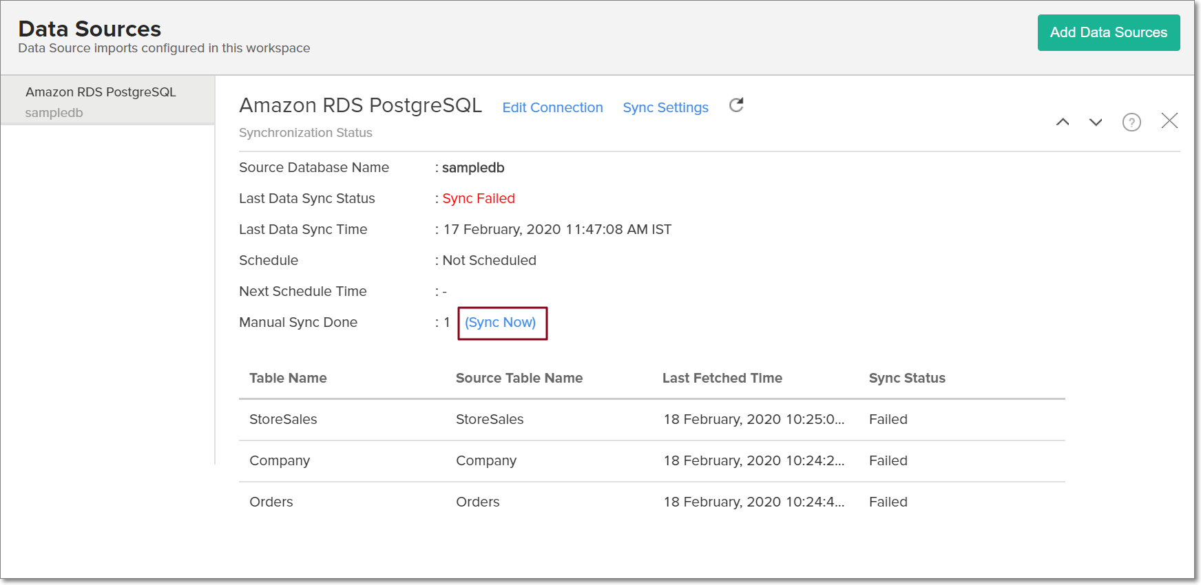 Navigate to the required data source, and click the Sync option that appears on mouse over the required table name.