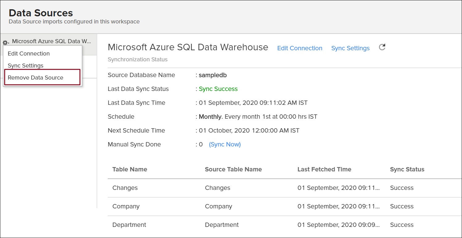 Note: Removing the data source does not delete the corresponding tables and reports from Analytics Plus. However, further synchronization cannot be carried out.