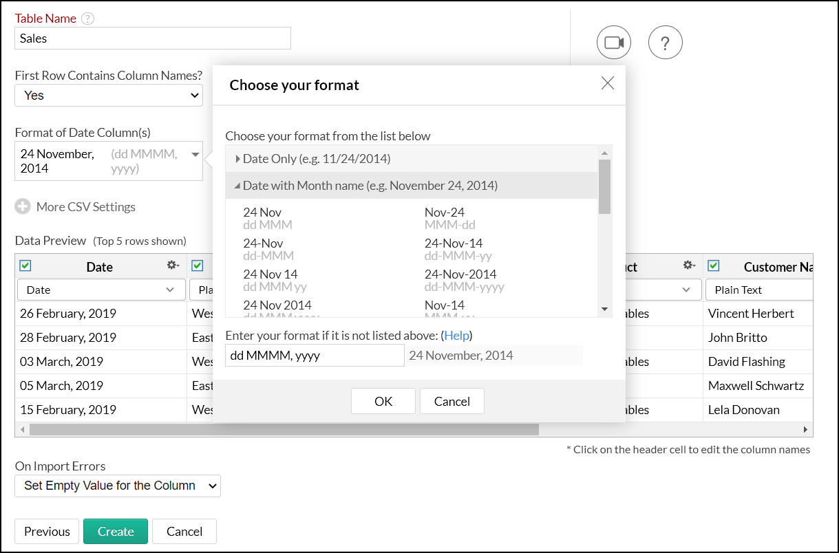 Analytics Plus automatically identifies the date format in the data being imported. However, you can also specify a custom date format from the Import Wizard in one of the following ways: