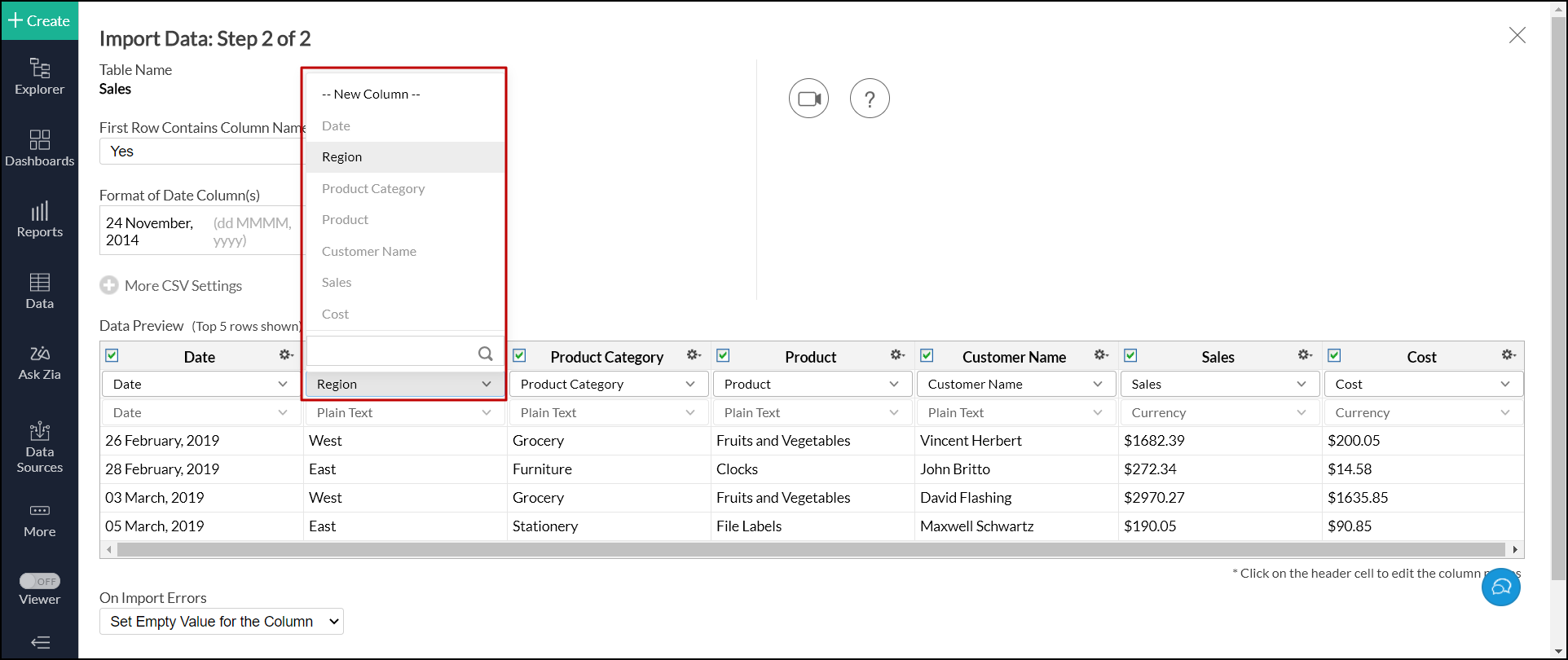 • Use the drop-down in the column header to choose the required column. You can either map the column to an existing column or import it as a new column.
