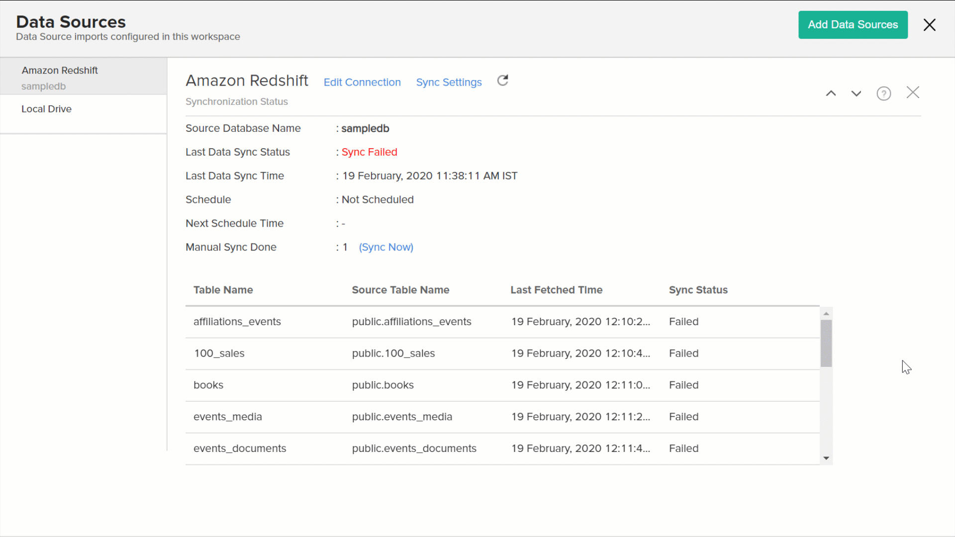 If you have created reports in Analytics Plus over columns or tables that don't have a direct mapping to the data in the database, mismatches will occur. These mismatches will be listed in the Cloud Database Connection Settings page, which can be accessed by clicking the Data Sources button from the side panel. Refer the following question to know more.