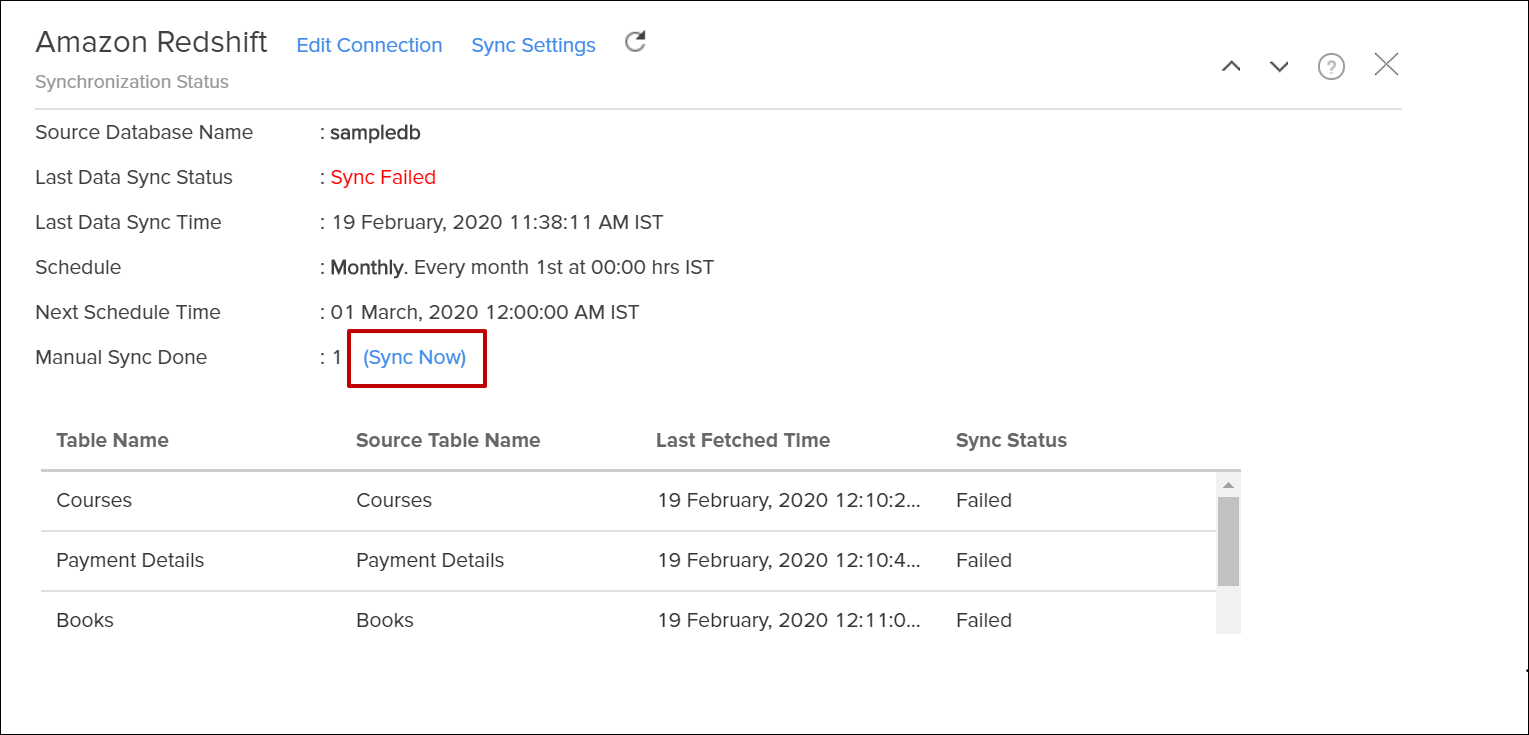 Click the View Last Import Details icon that appears on mouse over the listed tables. This opens the Import Details page, which provides detailed insight on the reason for the synchronization failure.