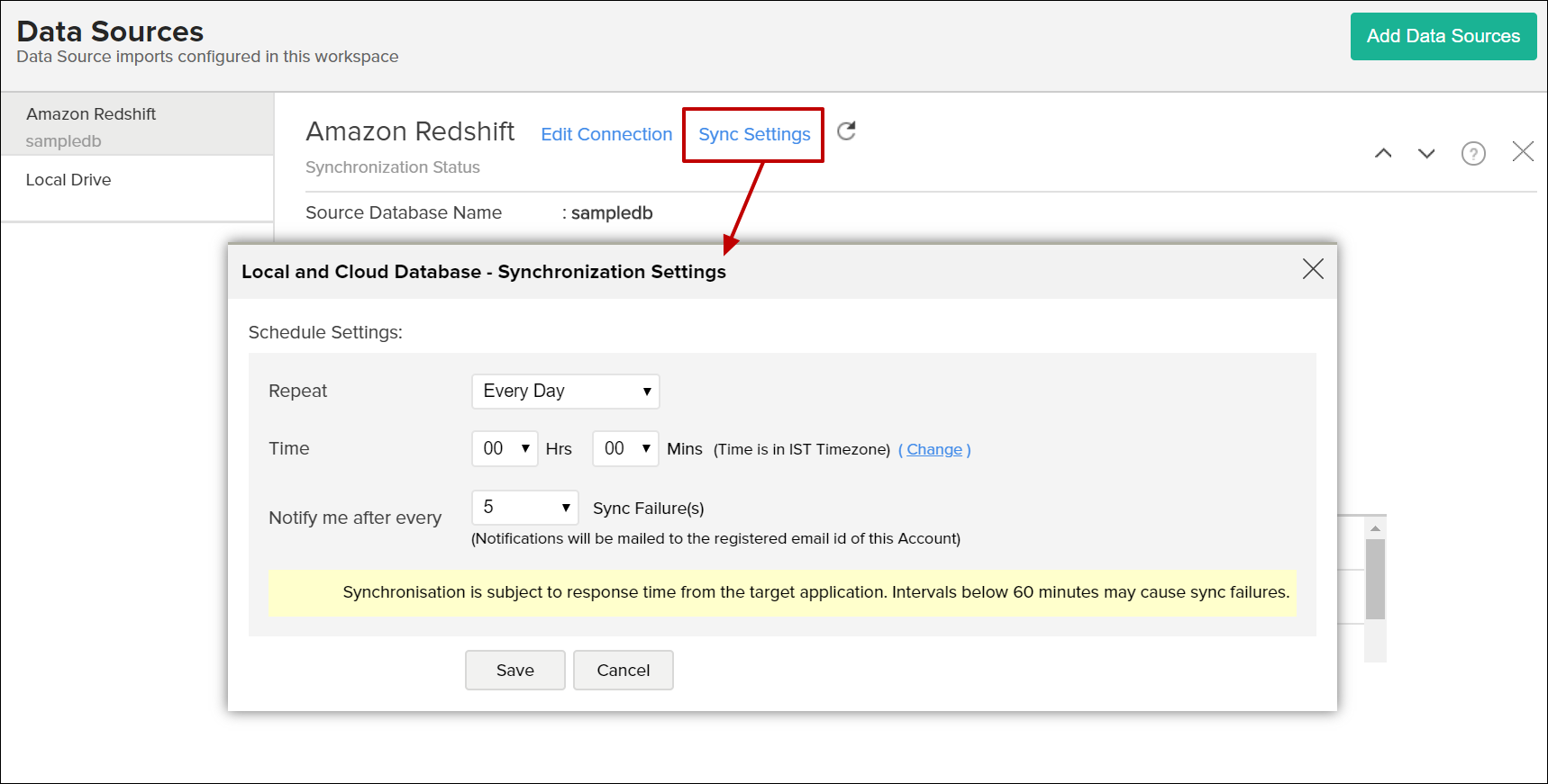 Click Save. The data from your Amazon Redshift database will be imported into Analytics Plus in the specified intervals.