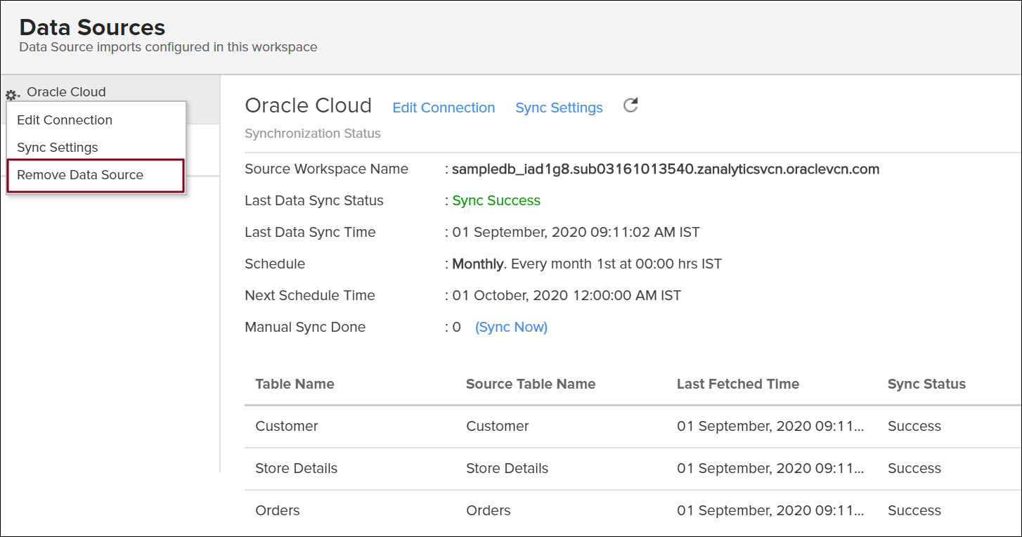 Select the Data Sources option from the side panel, and navigate to the required Oracle Cloud data source.