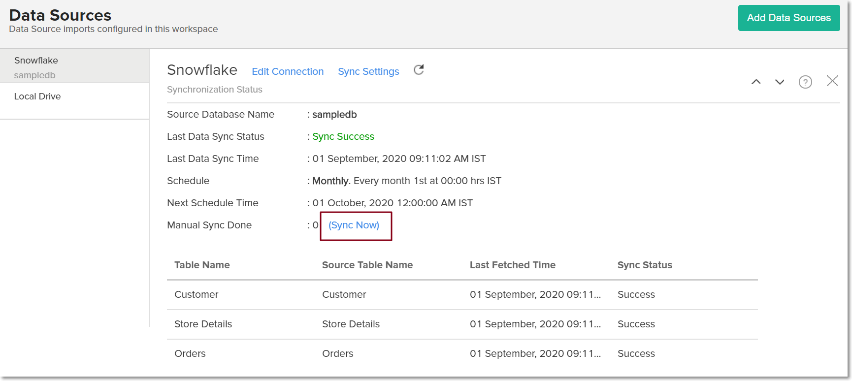Navigate to the required data source, and click the Sync option that appears on mouse over the required table name.