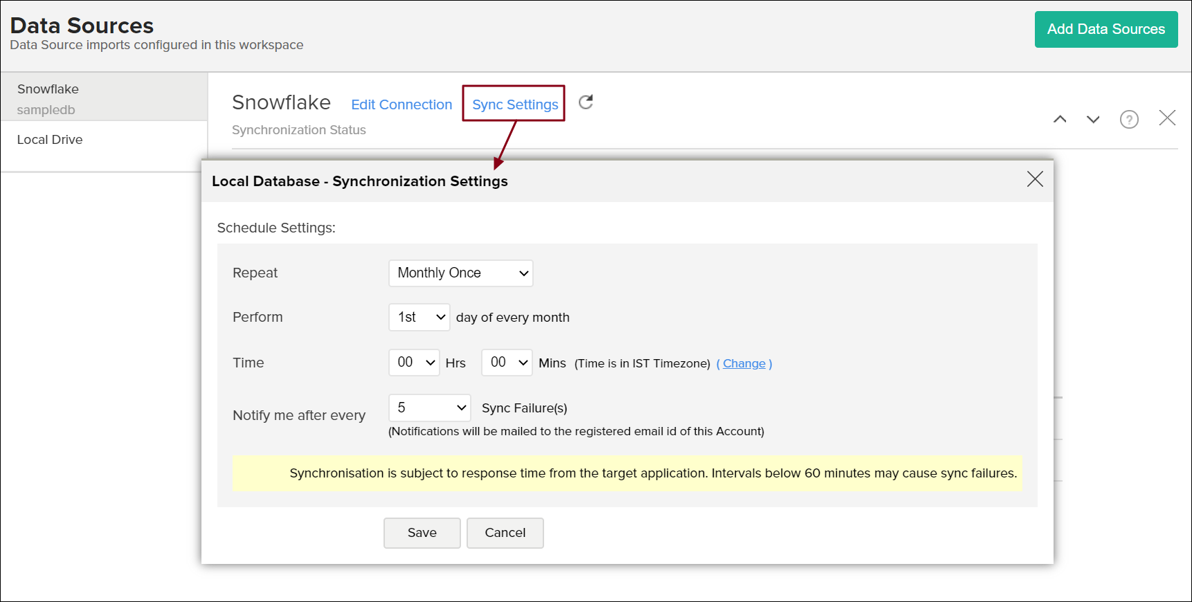 Click Save. The data from your Snowflake database will be imported into Analytics Plus in the specified intervals.