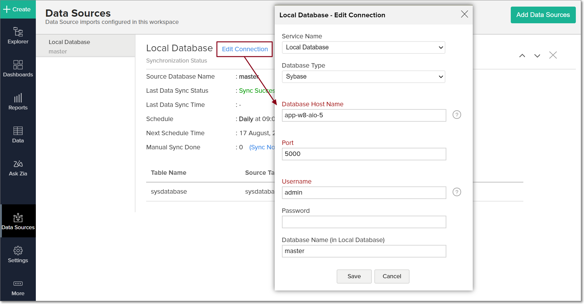 • Select the Data Sources option from the side panel, and navigate to the required Sybase data source.