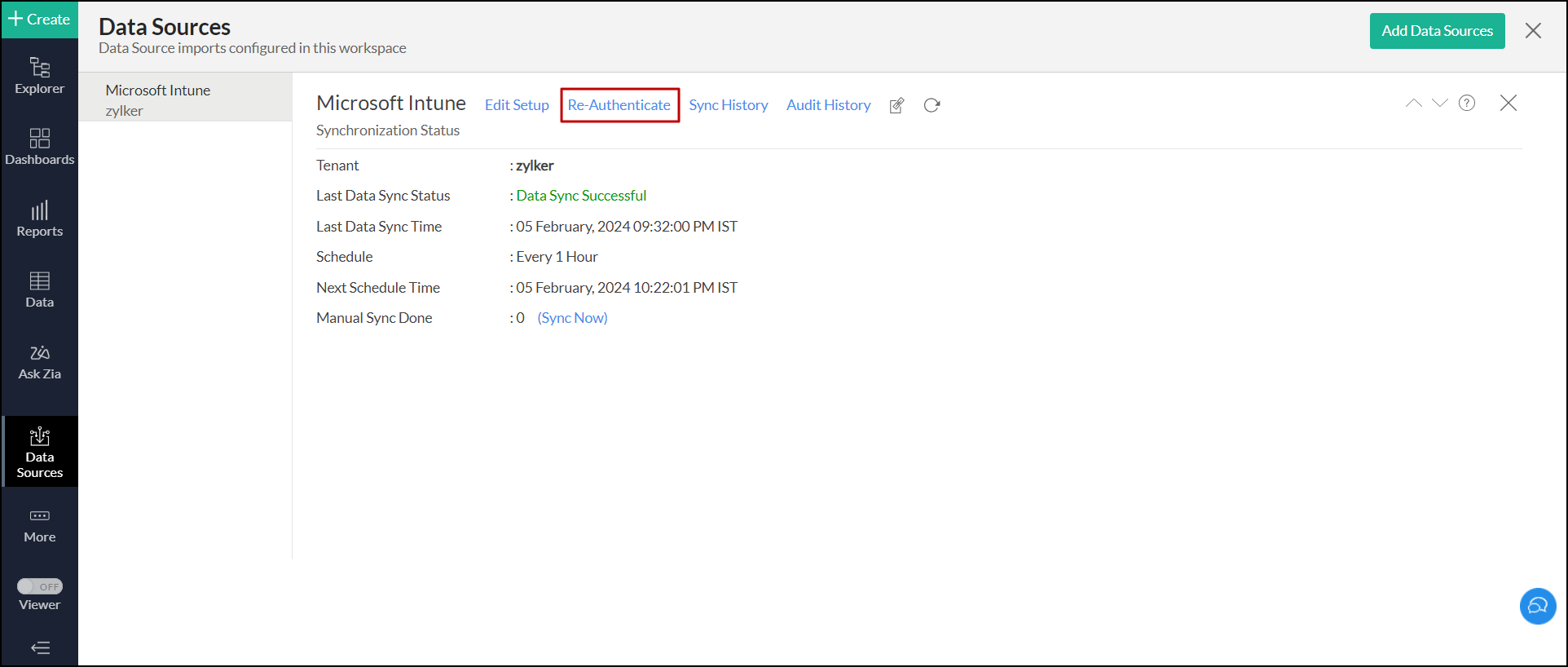 2. Navigate to the Microsoft Intune data source, and click the Re-Authenticate link.