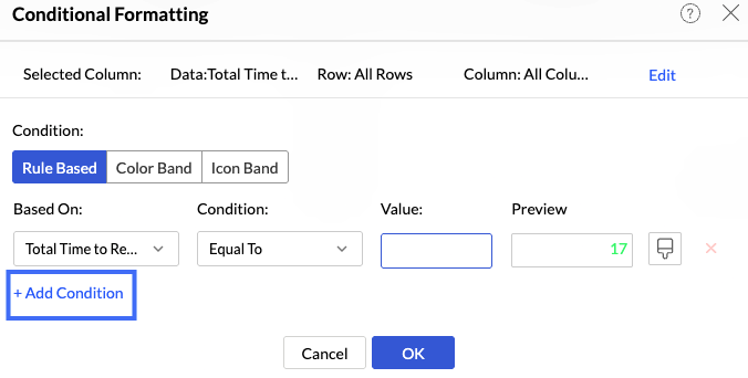 Click Add Condition to include more conditions. Specified conditions will be evaluated, and the corresponding formatting options will be applied to the data that meets the condition.
