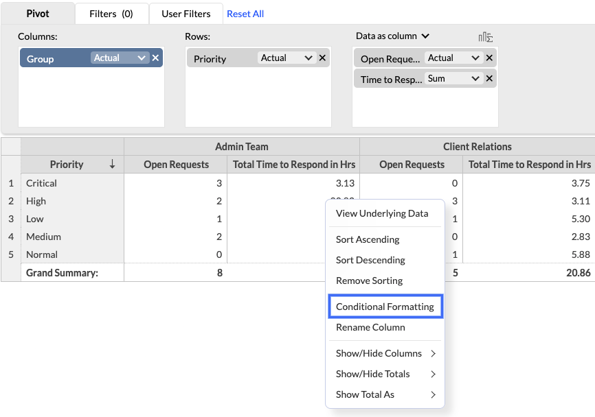 Analytics Plus lets you view and modify the conditional formats applied over the pivot view, from the Conditional Format tab of the Pivot's Settings page. Click the required data to view the corresponding conditional formats applied over it. Modify the conditions as required, and click Apply.