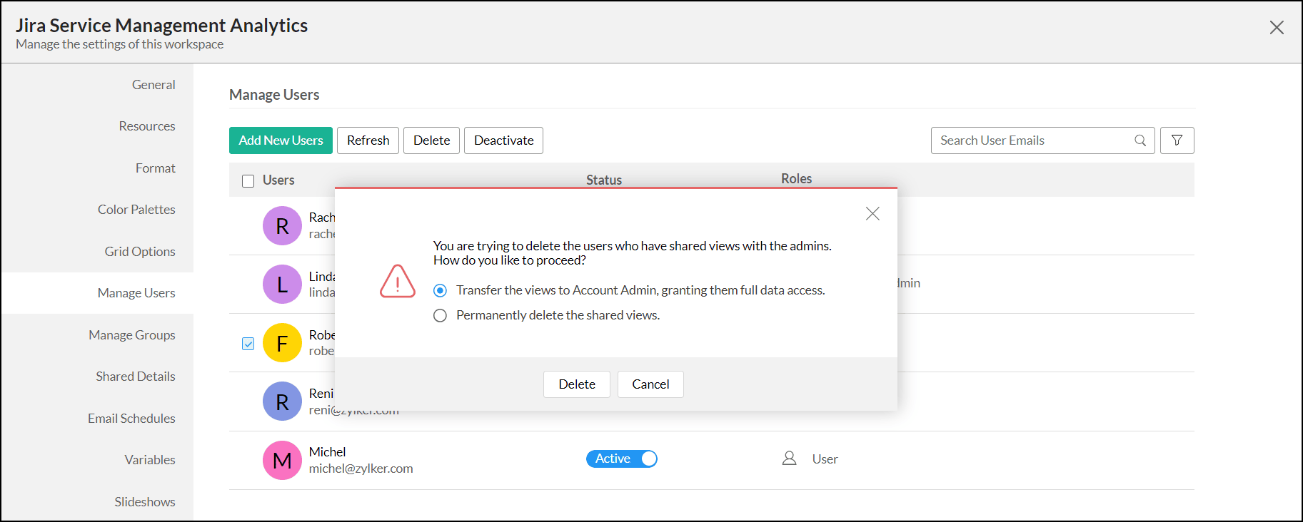 When removing a user from the organization, administrators can choose how to handle the views shared by that user. The following are the available options.