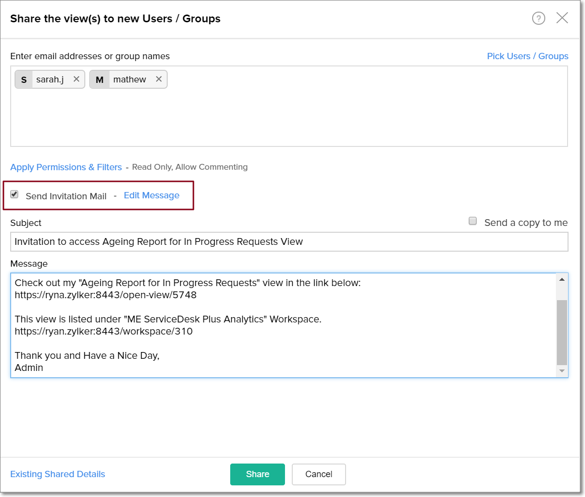You can choose to send an invitation email while sharing a view in Analytics Plus. To do this, click the Send Invitation Email checkbox in the Share the view(s) to new Users / Groups page. Edit the message if needed, and click Share.