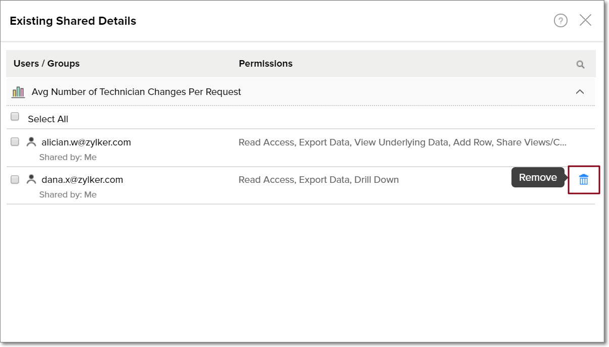 The Existing Shared Details popup appears, listing every user the view is shared with. Click the Edit icon that appears on mouse over the required user, modify the permissions as required, and click OK.
