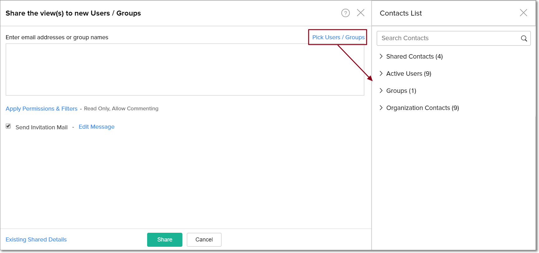 To do this, click the Pick Users / Groups link in the Share the View(s) to new Users / Groups page. This opens your Contacts List, displaying your Shared Contacts, Active Users, Groups and Organization Contacts. Choose the required users from these lists, and proceed with the sharing process.
