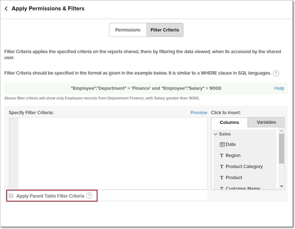 Analytics Plus allows you to apply a parent table's filter criteria to the reports and dashboards created over the table by selecting the Apply Parent Table Filter Criteria option in the Filter Criteria tab. If you have already shared the parent table to a user with a specific filter criteria, this option allows you to share the dependent reports and dashboards with the same criteria applied over them.