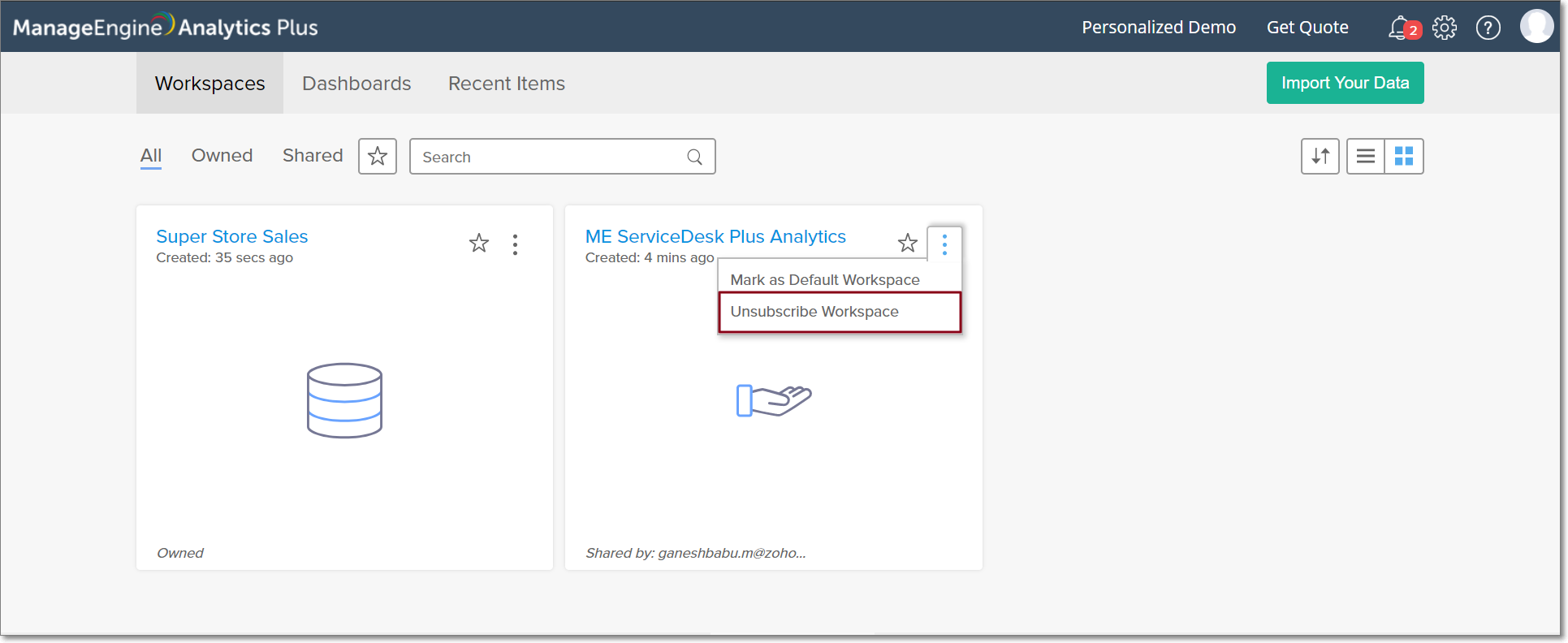 You can easily unsubscribe from any shared workspace in Analytics Plus. By unsubscribing from a workspace, you will no longer be able to access the views in that workspace.