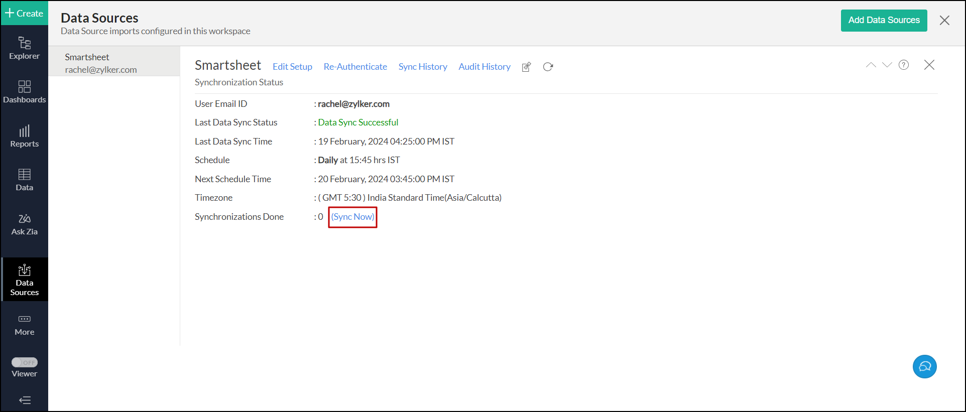 Yes. To do this, click the Data Sources option from the side panel. In the page that appears, navigate to the Smartsheet source and click the corresponding Sync Now button.