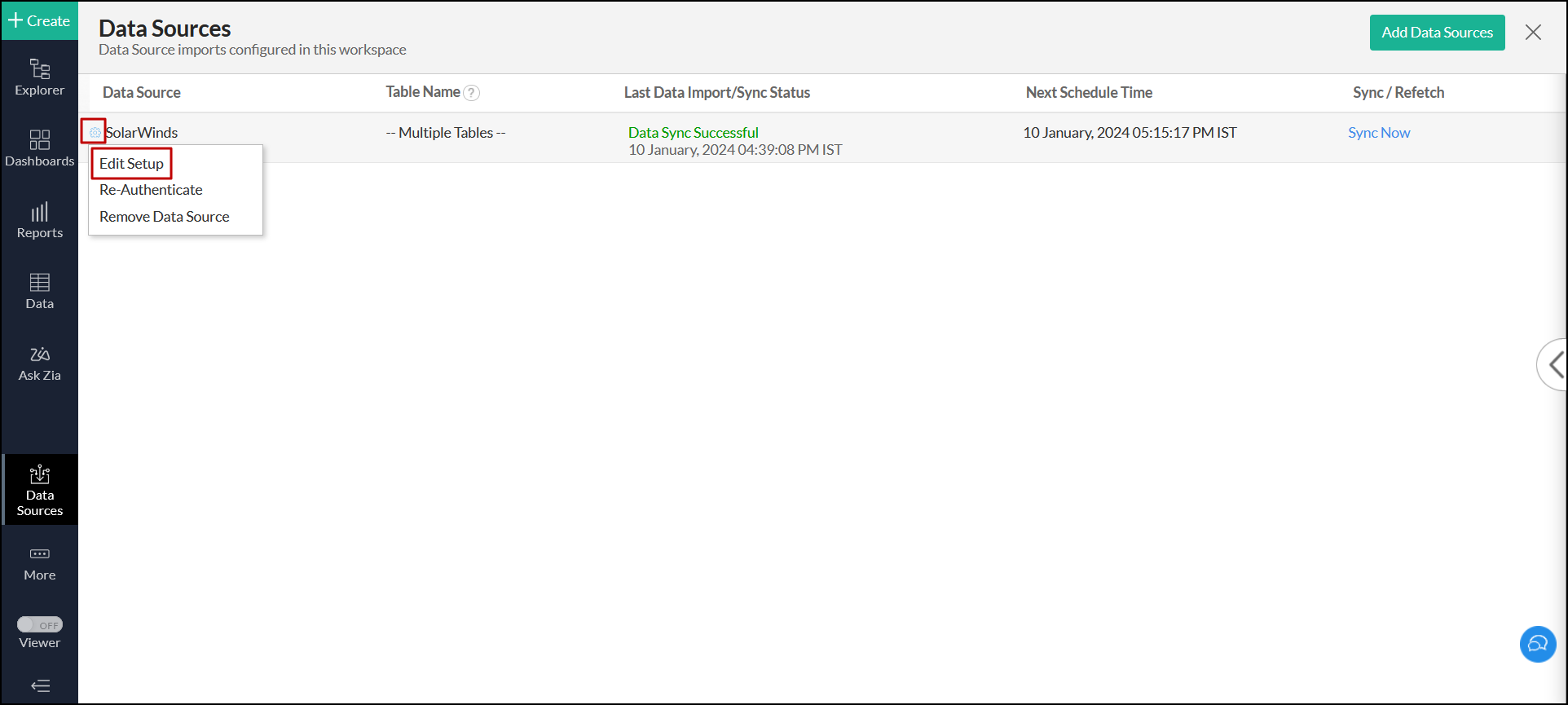 - Navigate to the SolarWinds data source, and click the Edit Setup link.