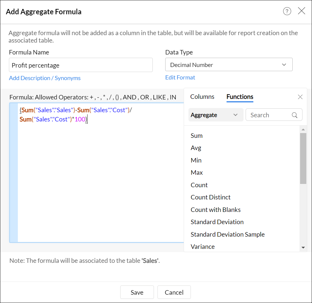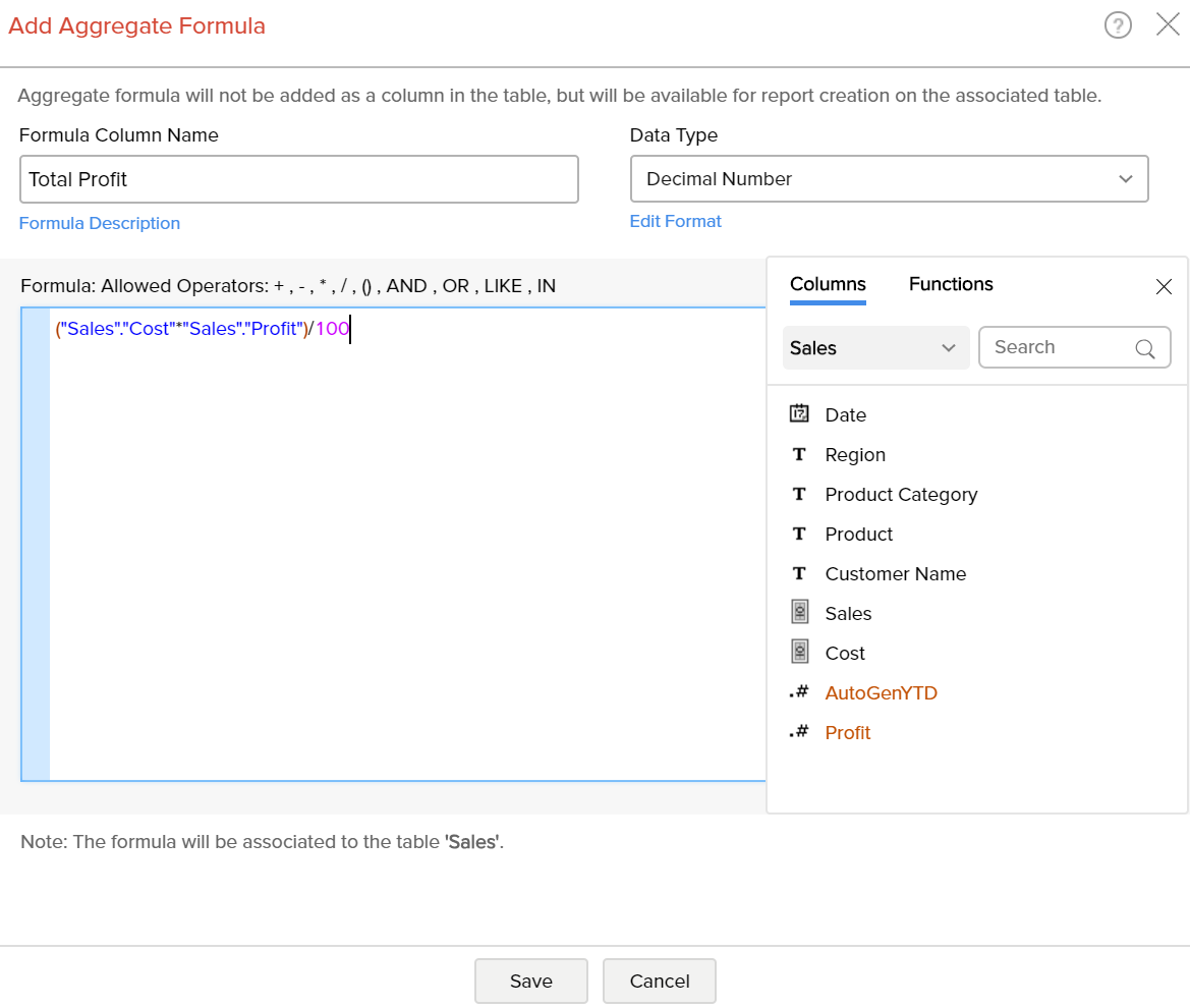 - For example, to apply an aggregate formula to calculate % Profit the formula could be something like (SUM("SALE")- SUM("COST"))/SUM("COST")*100 as shown in the screenshot below.
