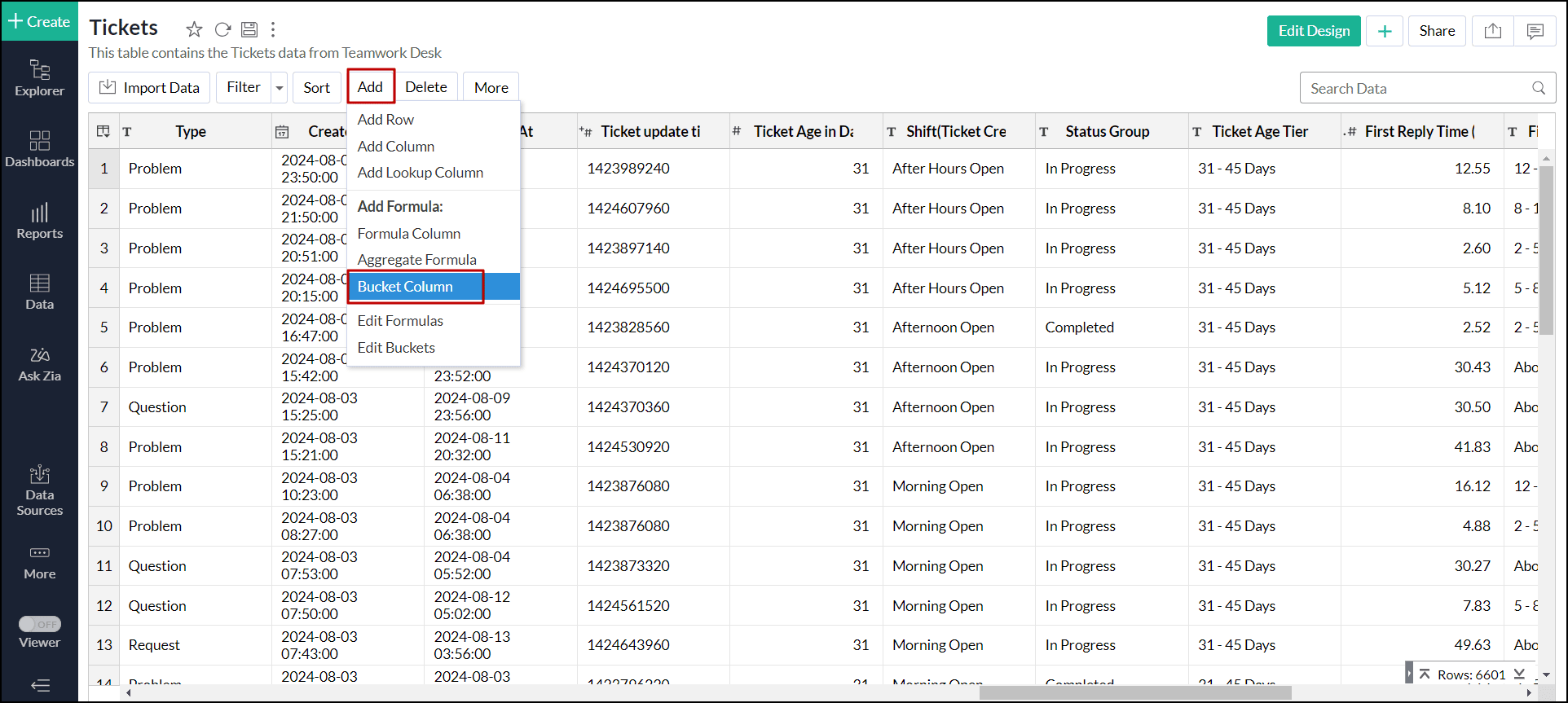 2. Click the Add option on the toolbar and choose Bucket Column. (or) Right-click the column you need to create buckets for and choose Add Buckets from the drop-down.