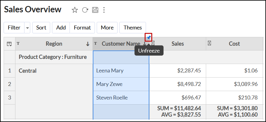 To unfreeze the column, click the Unfreeze (pin) icon on the top right corner of the column header.