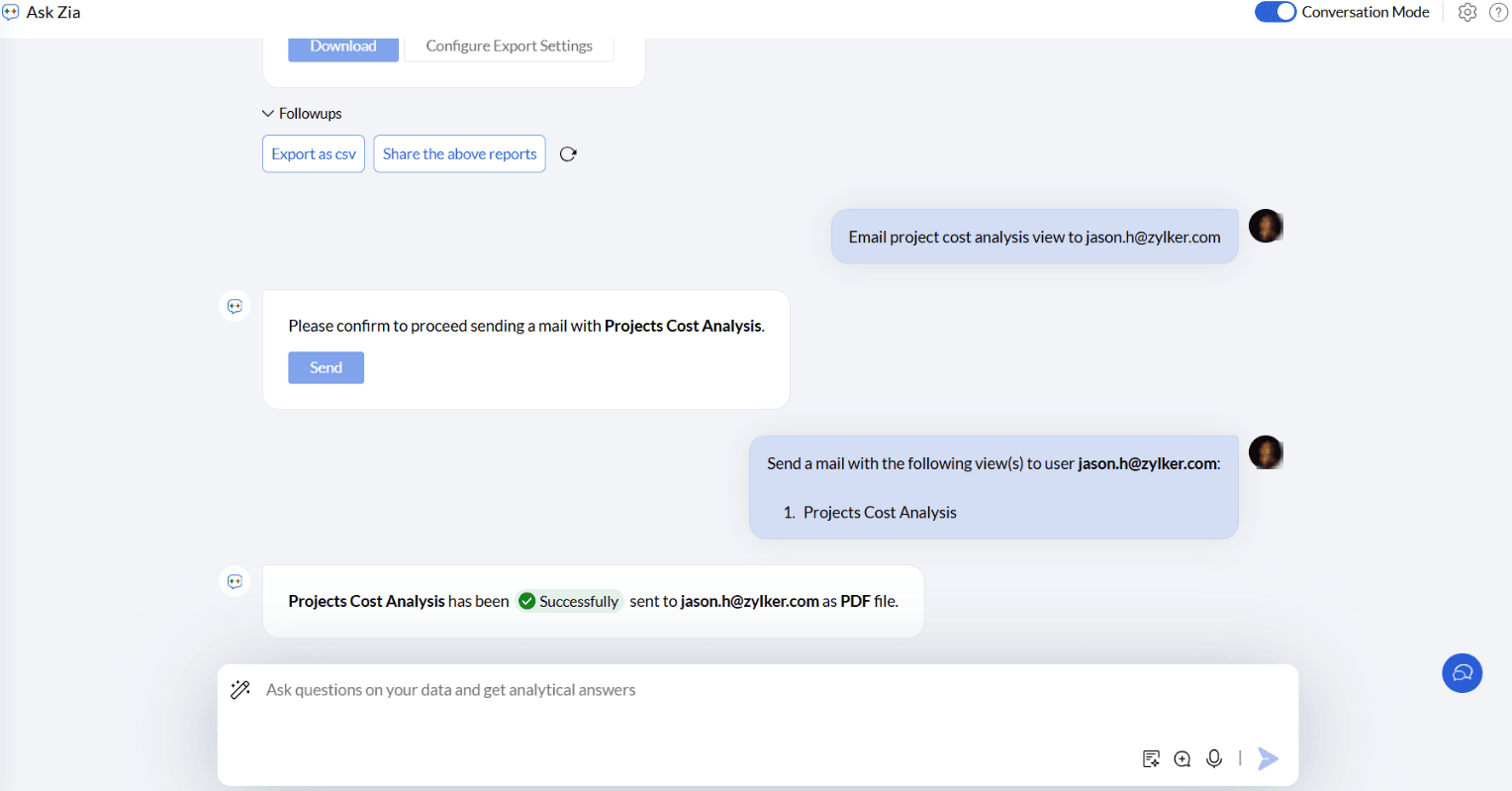 In the prompt section, type Share the following {View Names} to the {user email id}. Synonyms like send, forward, and deliver can be used in the prompts. Once entered, Ask Zia will prompt for confirmation of the sharing permissions.