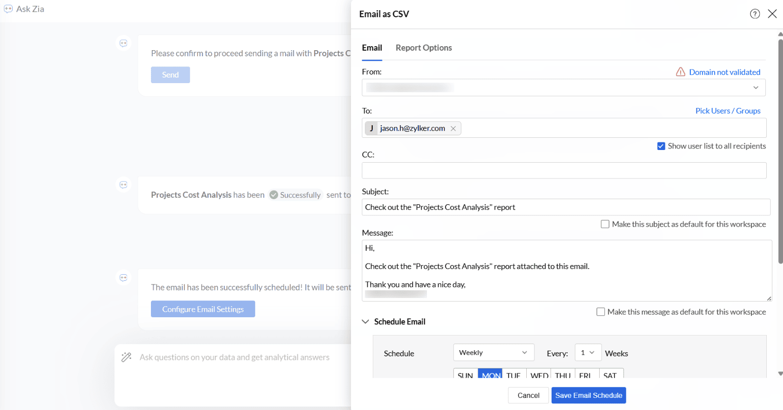 Ask Zia will prompt you for any missing information, such as the view name, recipients, or schedule details, if not already provided.