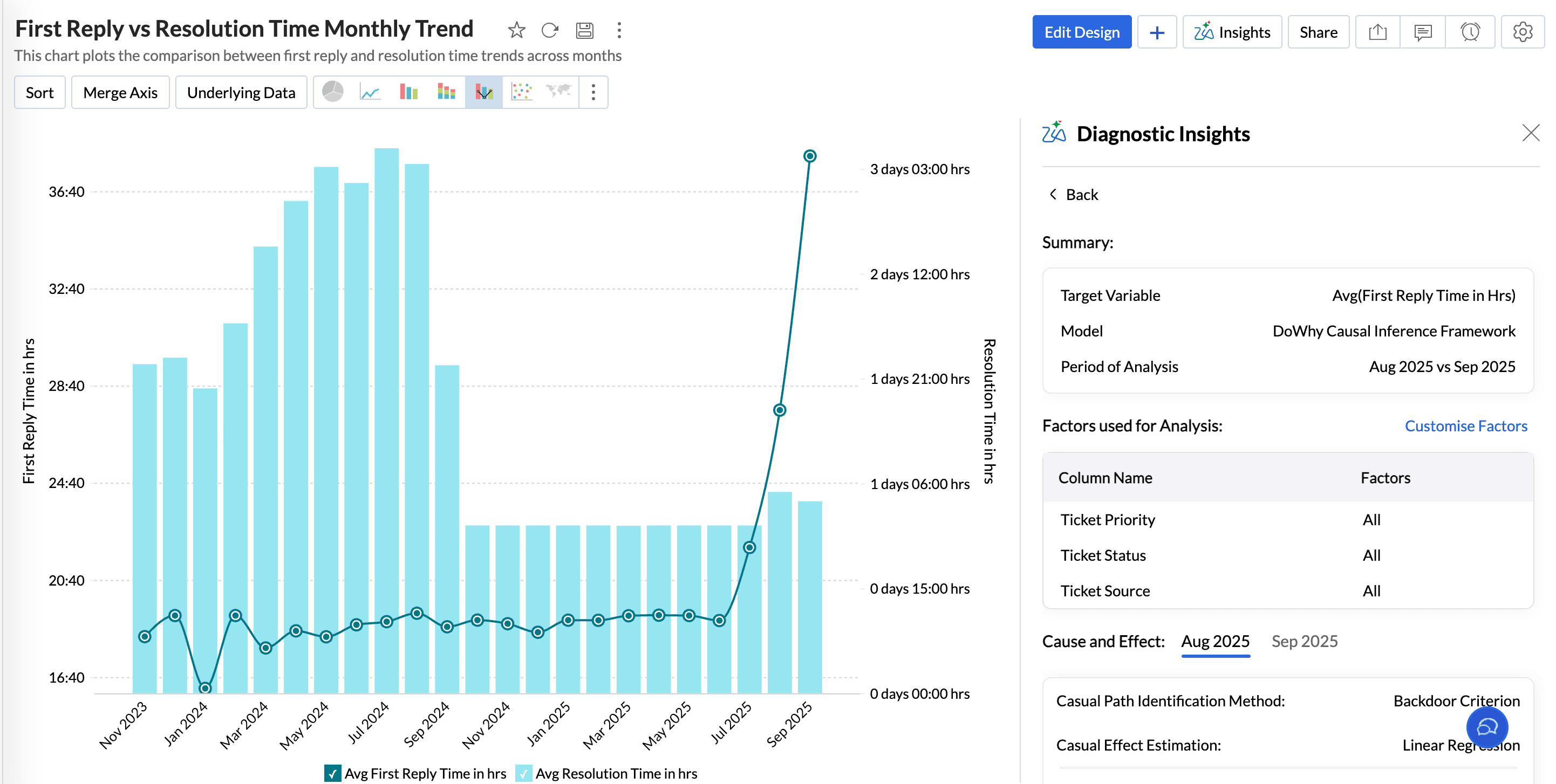 - Trends and Relationships analysis between the target measure and influencing measures reveals whether there is an increasing or decreasing trend. It also determines the type of correlation, whether direct or indirect, and offers prescriptive recommendations to sustain or enhance the observed trend.