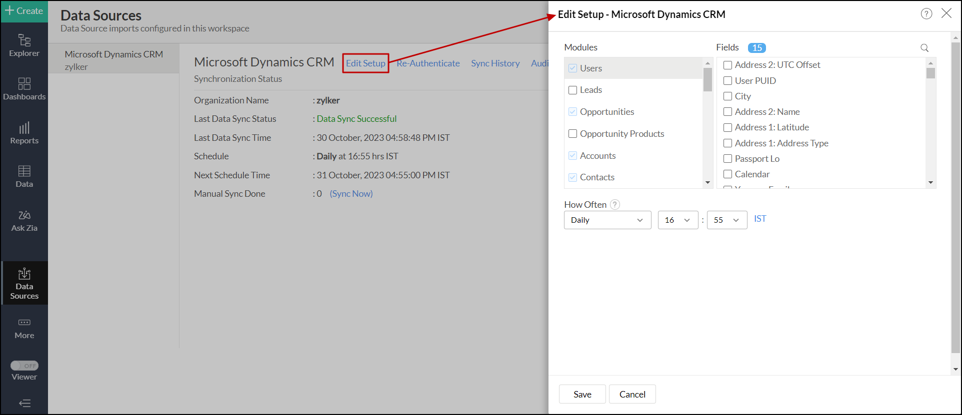 1. Click the Settings icon that appears on mouse over on the Microsoft Dynamics CRM data source and click the Edit Setup option.
