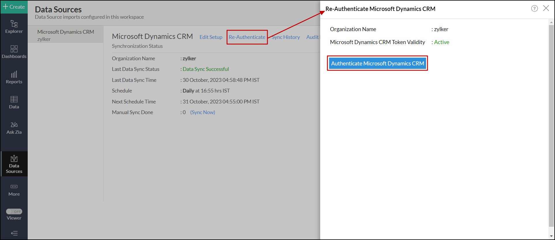 2. Navigate to the Microsoft Dynamics CRM data source, and click the Re-Authenticate link.