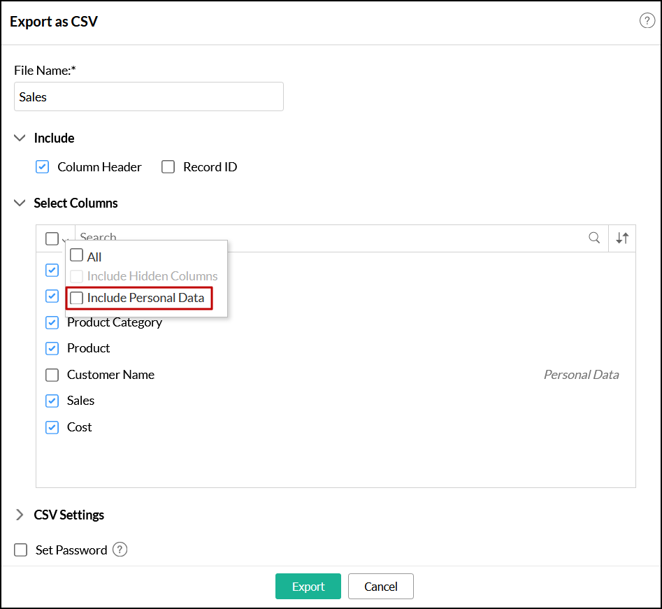 Columns marked as 'personal data', i.e. columns that contain Personally Identifiable Information (PII), will be excluded during export operations. Users can opt to include these columns manually using the column picker while exporting the view.