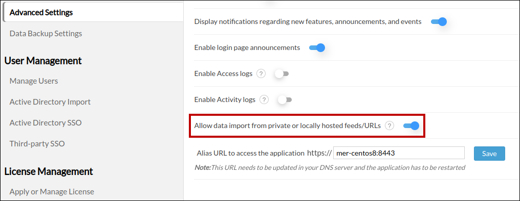 - This option allows users to fetch data from a URL that is hosted within a private network/LAN. This feature is enabled by default and can be disabled using the toggle button. Turning off this option will allow admins to restrict data import from confidential data hosted in the private network.
