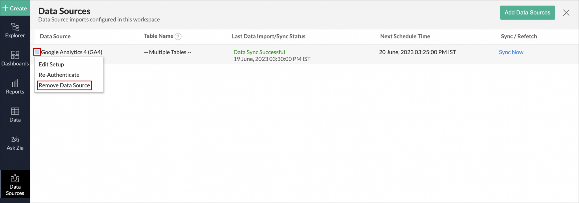 - Open the required workspace, and click the Data Sources option from the side panel.