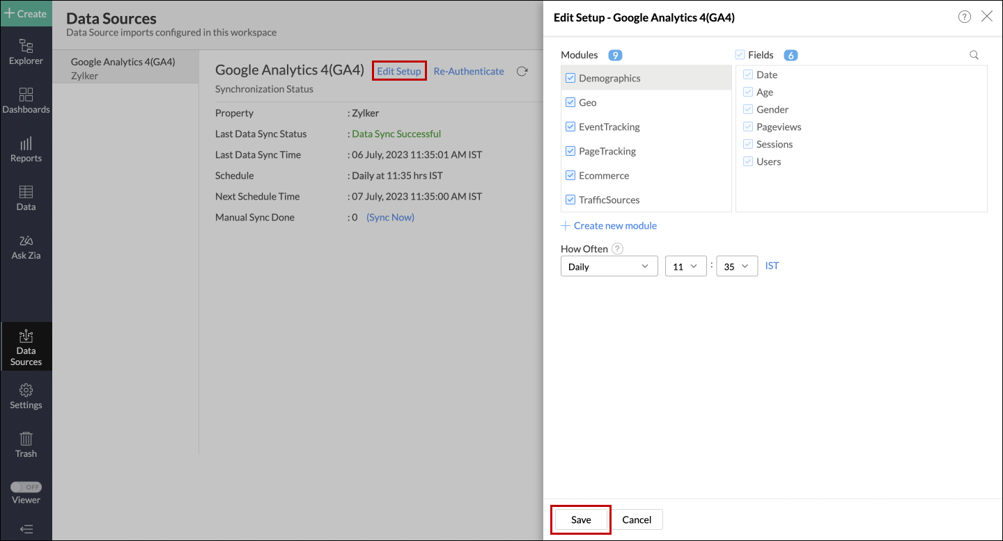 - Navigate to the Google Analytics 4 (GA4) data source, and click the Edit Setup link.