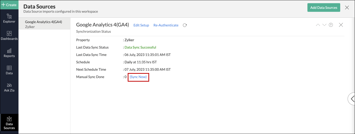 You can also access the Google Analytics 4 (GA4) data source page, and click Sync Now.