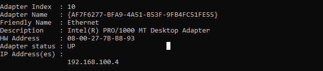 - Locate the NIC card whose Adapter Status is UP, copy the Adapter Name and paste it in a separate file. It will be the NIC address of the corresponding server.