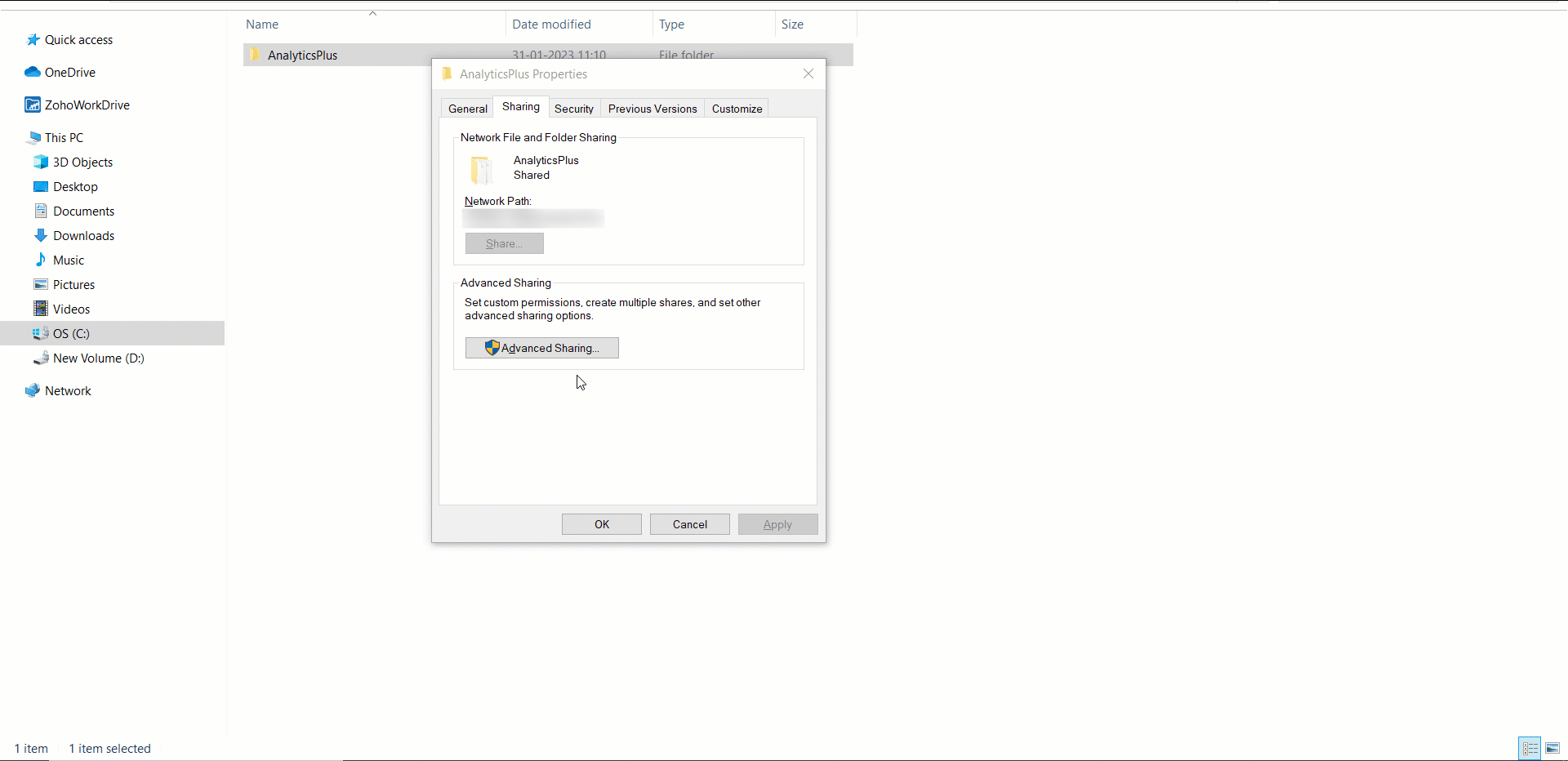 - To verify the shared folder access, open the Run dialog and type \\<IP>\AnalyticsPlus from another server (i.e., If you are sharing the AnalyticsPlus folder present in the primary server, try accessing it from the standby server and vice versa).