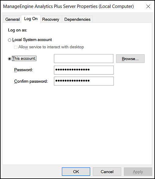 To restart Analytics Plus with admin privileges, open the Services window and navigate to the ManageEngine Analytics Plus listing. Right-click on the service name, select the Properties option and head to the Log on tab. Enter your administrator credentials, and click the Apply and OK buttons to reflect the change.