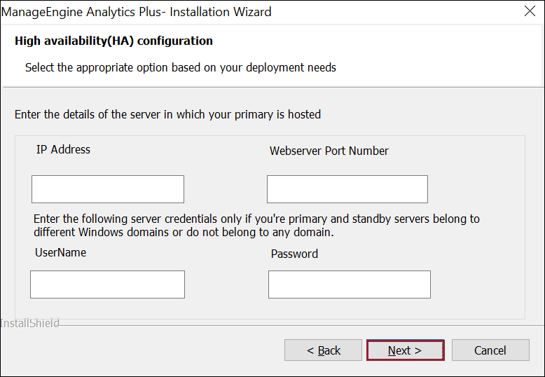 - Enter the primary server's static IP address and port number. If the primary and standby servers are on different domains or do not belong to any domain, provide the primary server's credentials as well, and click Next to proceed with the installation process.