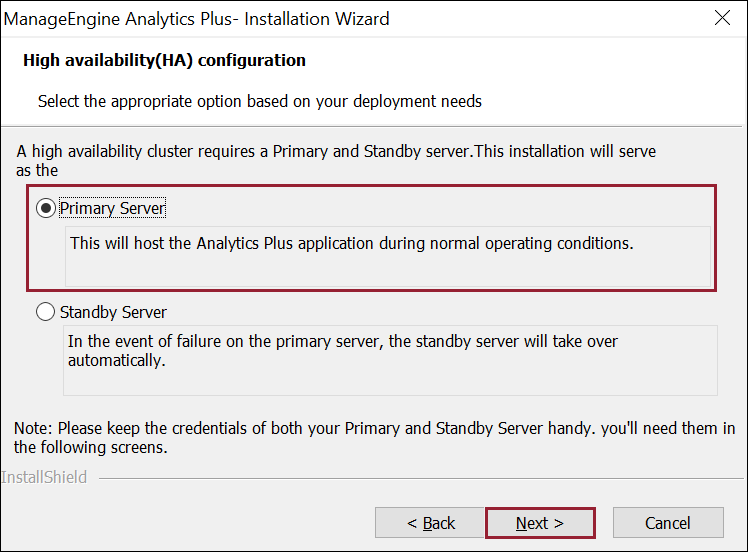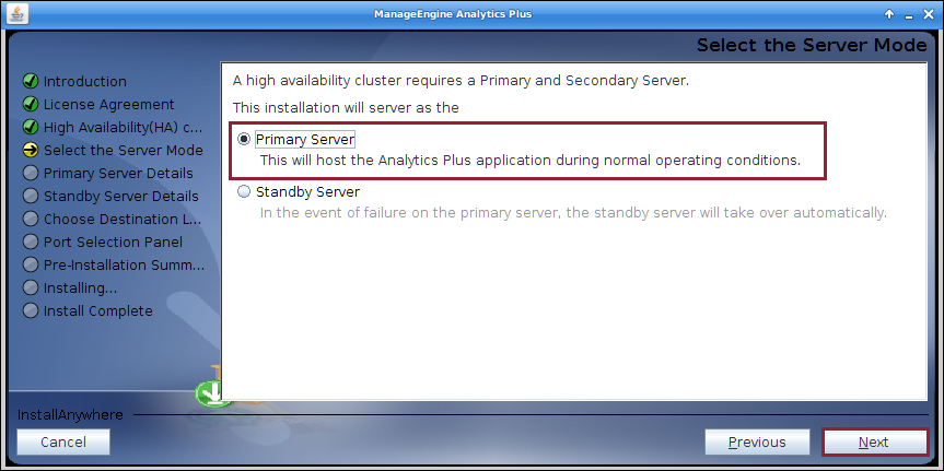 Select the Primary Server radio button in the following screen, and click Next to proceed with the installation process. Upon successful installation, your primary server will be configured.