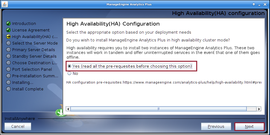 During the Analytics Plus installation process, select the Yes radio button in the High Availability Configuration screen, and click Next to begin setting up the high availability functionality.