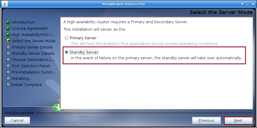 - During the installation process, select the Standby Server radio button in the High Availability (HA) configuration screen, and click Next to proceed.