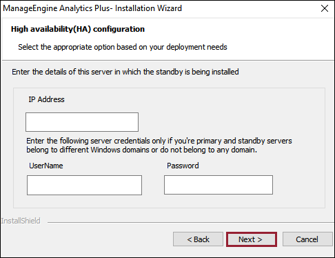 - Enter the standby server's static IP address. If the primary and standby servers are on different domains or do not belong to any domain, provide the standby server's credentials as well, and click Next to proceed with the installation process.