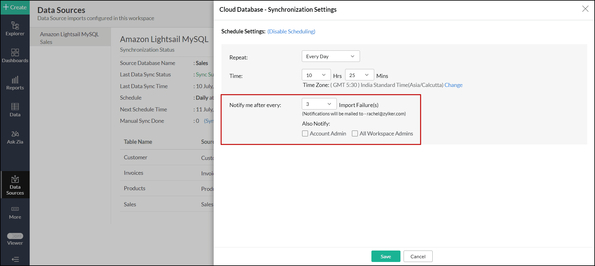 Analytics Plus allows you to get notified of consecutive import failures, while setting up data schedules. To do this,