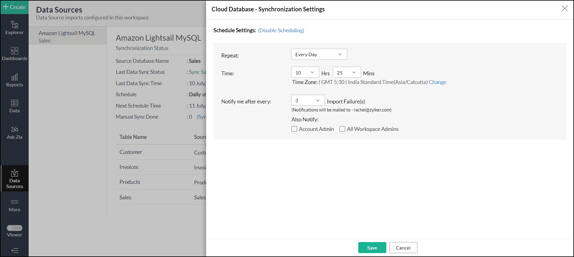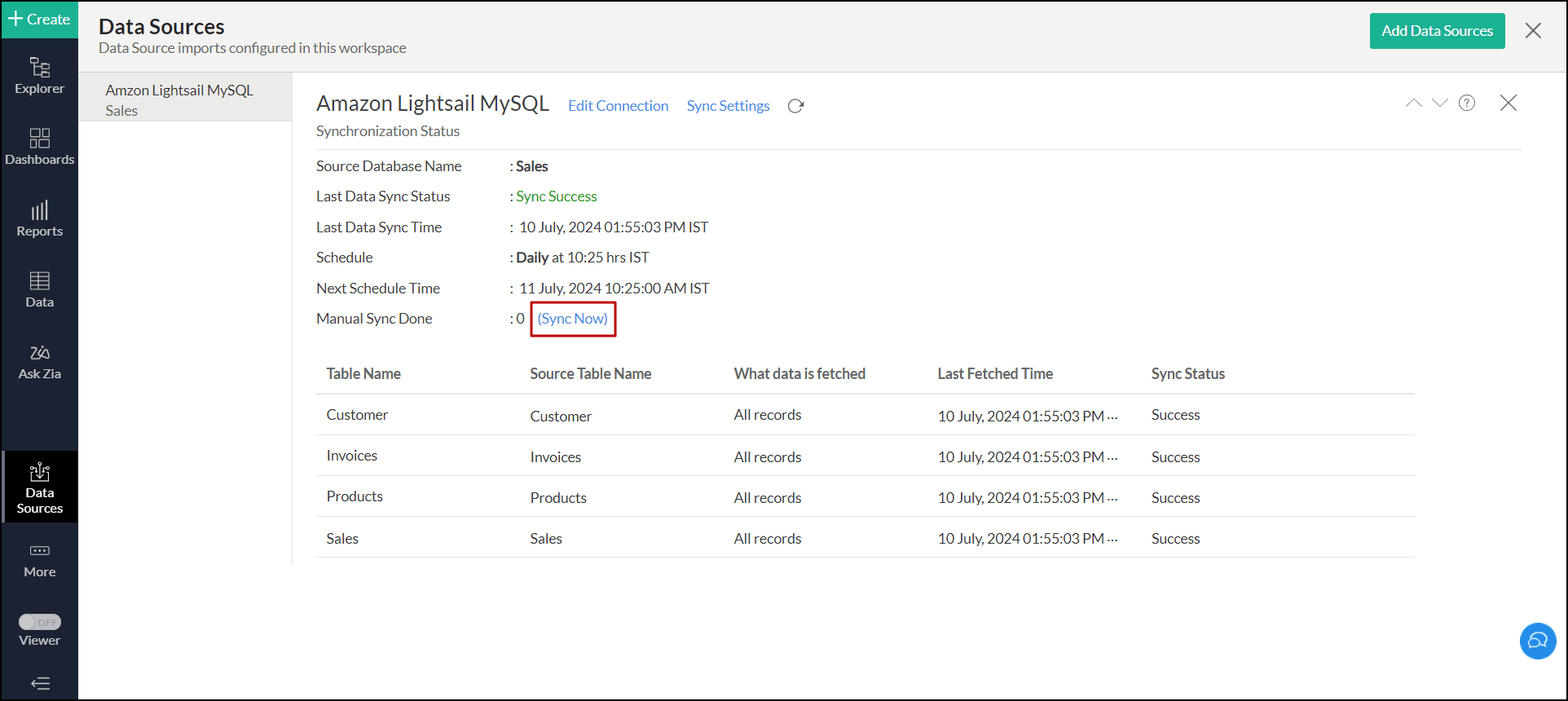 Analytics Plus allows you to schedule data import for any existing tables imported from Amazon Lightsail MySQL database. Follow the steps below to do this.