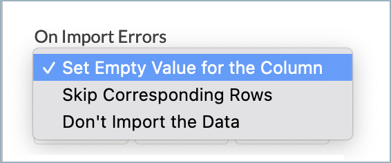 - Set Empty Value for the Column (default) - Select this option to set empty value to the corresponding column value which had problems while importing.