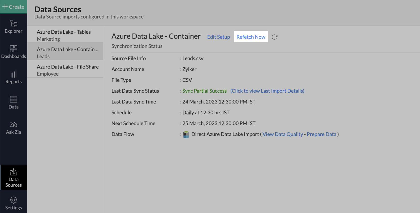 After setup, you might have to wait sometime for the initial fetch to happen. This depends upon the amount of data imported into Analytics Plus and also the response time of your Azure Data Lake server. You will receive an email notification once the import is complete. Please note that, if you access the workspace before the initial fetch, it will not display any data.