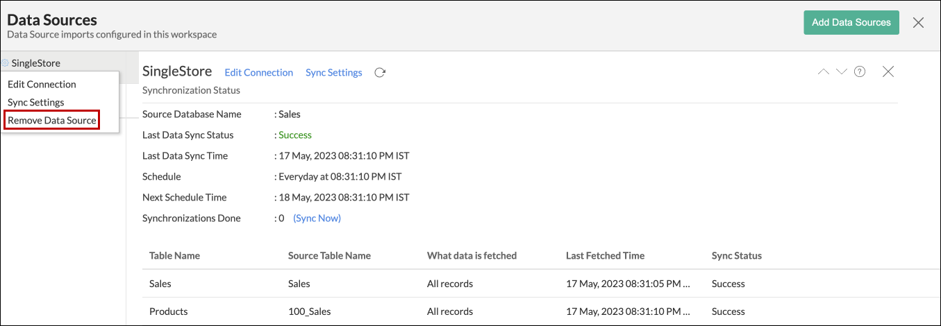 Navigate to the required SingleStore data source and click the Sync Now link.